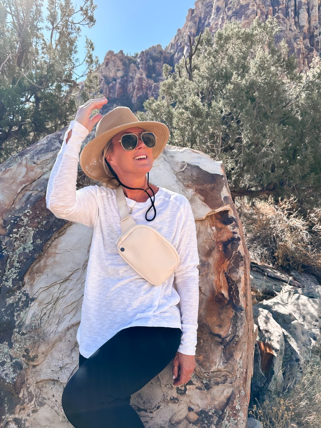 Spanx Booty Boost Leggings (Small) | Long Sleeve Tee (XS) | Belt Bag | Similar Straw Hat