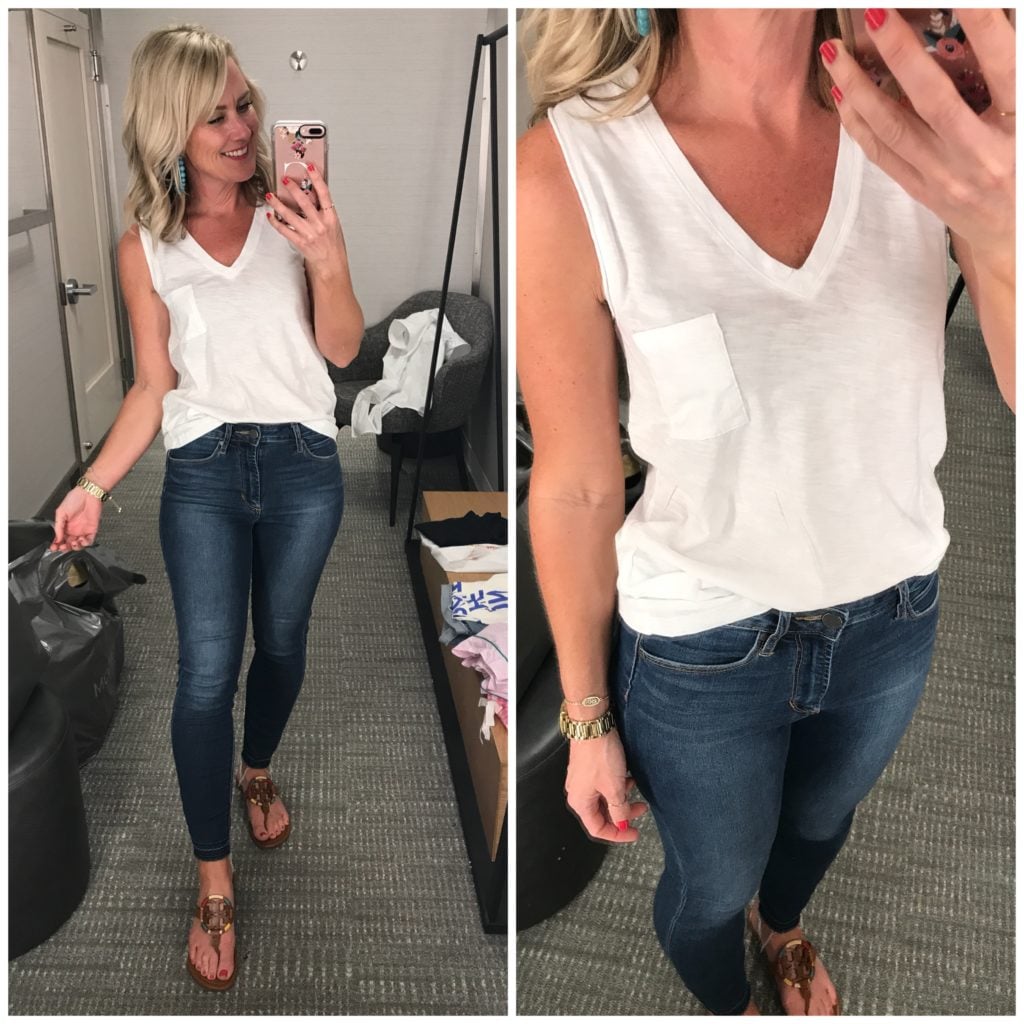 I think I shared this tank in a previous post, but I’m so smitten with it I grabbed more colors. It’s the perfect v-neck with a slight racerback shoulder (but not enough to require a special bra). The cotton is soft, but not sheer, and the pocket elevates the tee a bit.