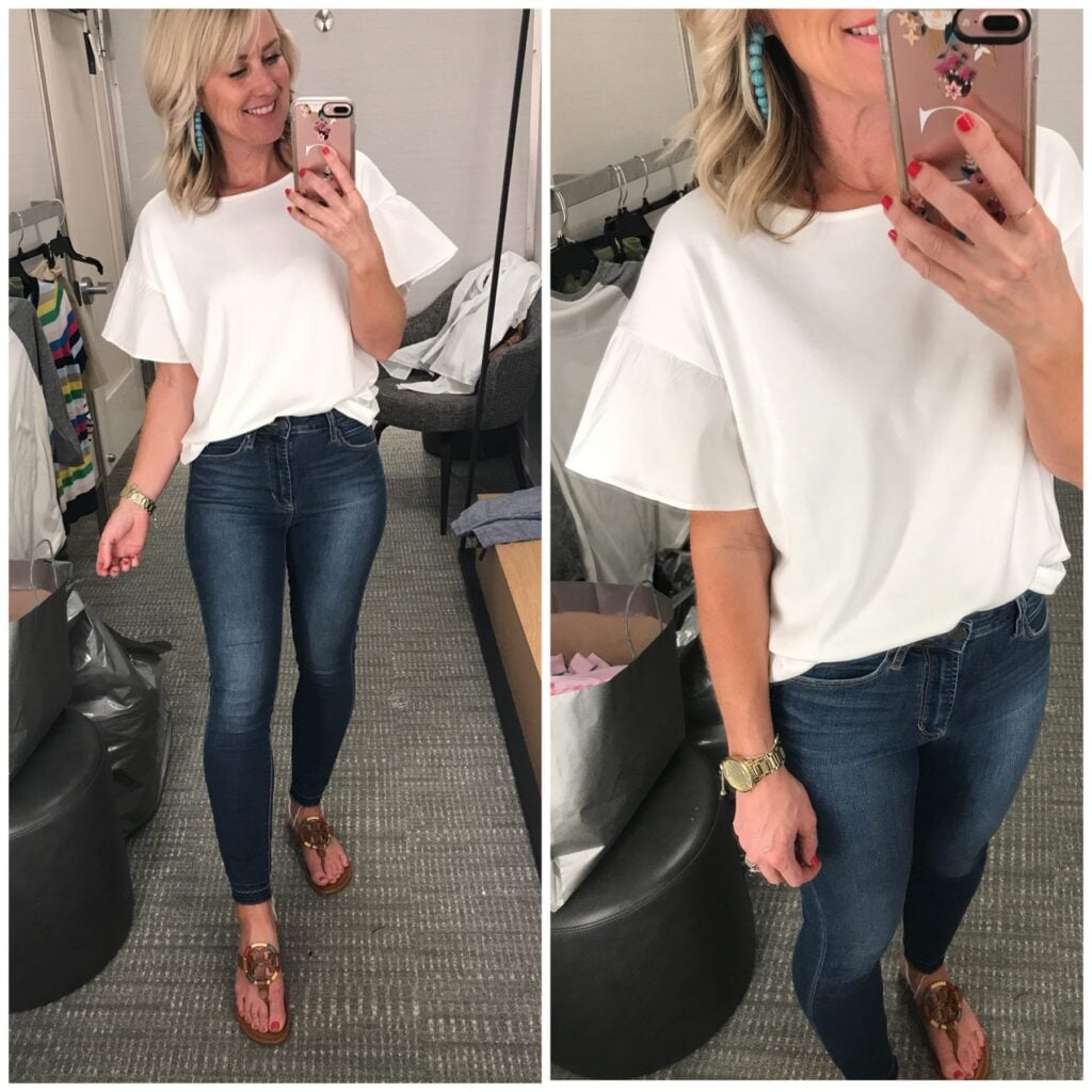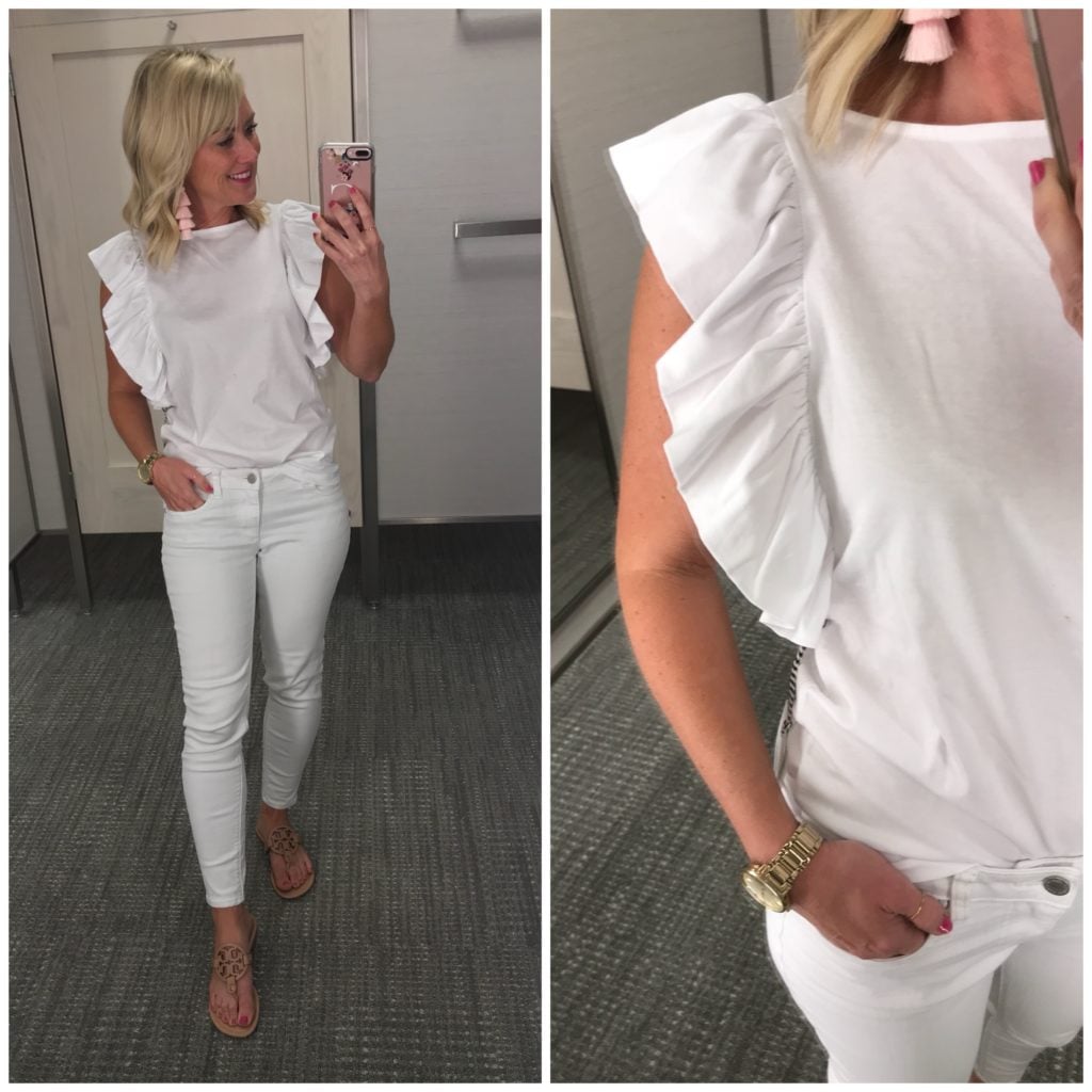 Ruffle Sleeve Tee | White Jeans | Sandals | Earrings