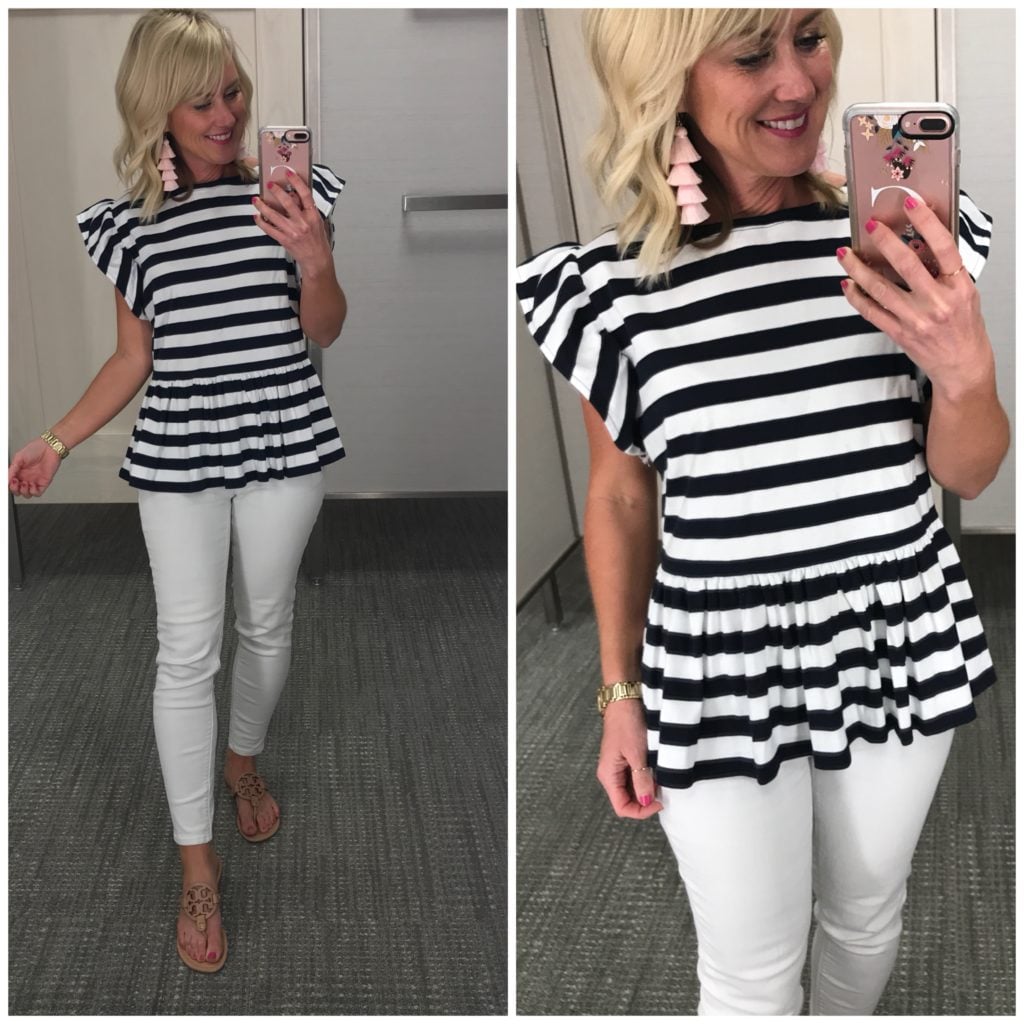 This top is the trifecta of cute tops…peplum hem, flutter sleeves, and stripes! Unfortunately it runs a little large, and the XS was too big for me.