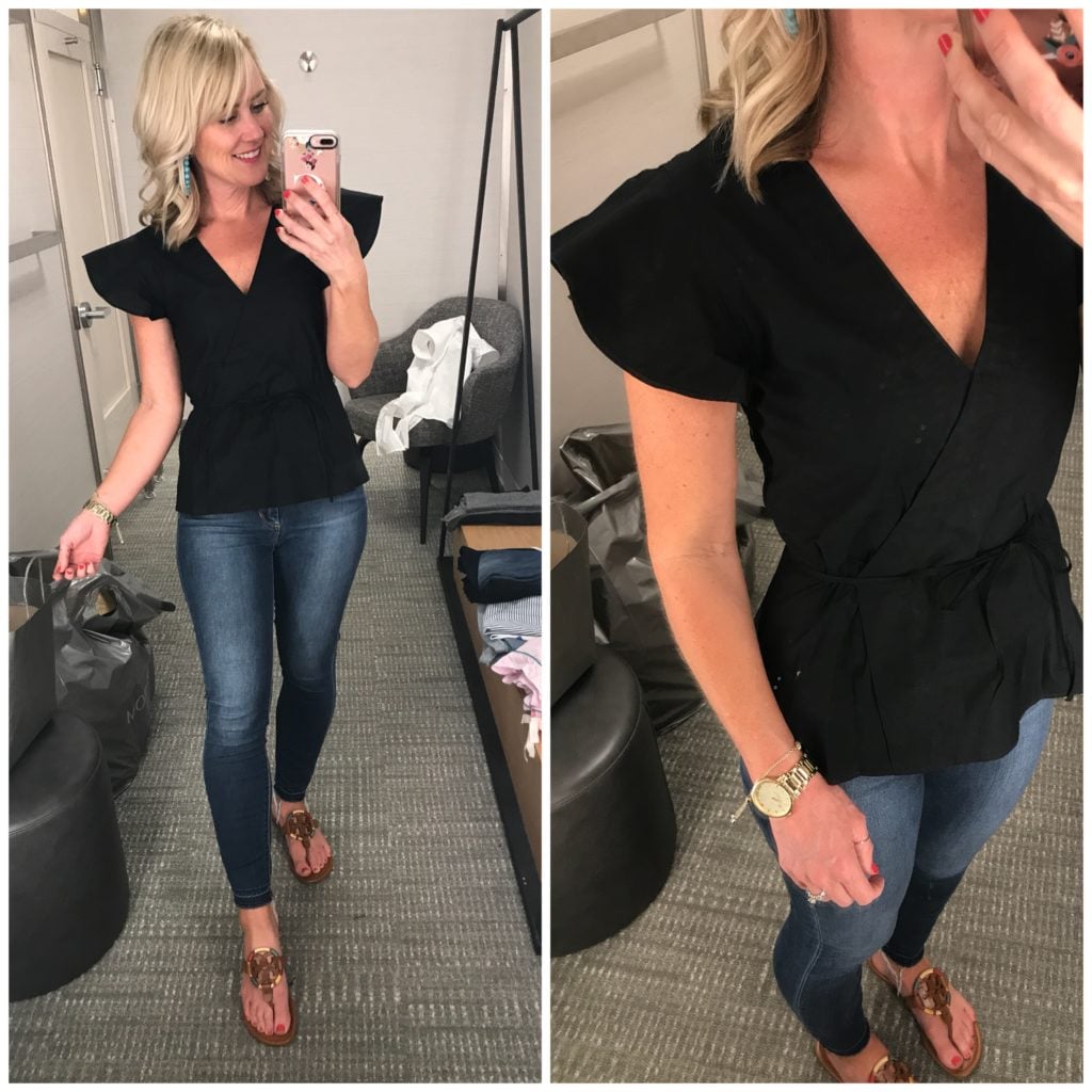 It’s hard to see the details of this black top in the pic, but it’s a mock-wrap style with flattering tie and slight peplum hem. The material is a crisp cotton poplin, and a style that’s easily dressed up or down. The ruffle sleeve is slightly exaggerated, but creates an hourglass shape. It would be so chic with a pencil skirt!