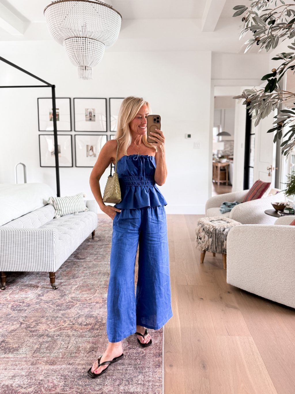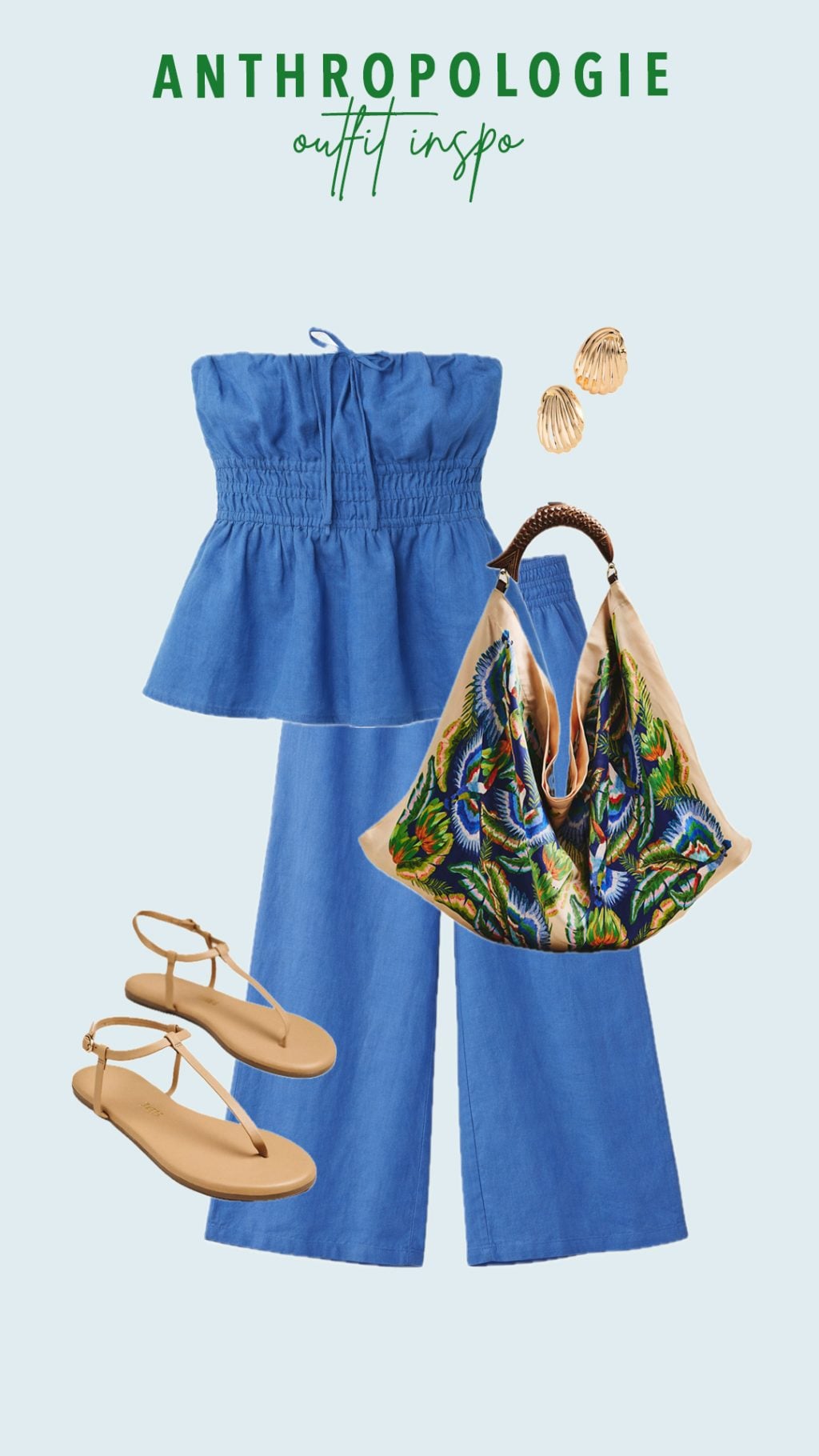Strapless Top | Earrings | Sunglasses | Flip Flops | Linen Pants | Denim Top | Sandals | Purse
