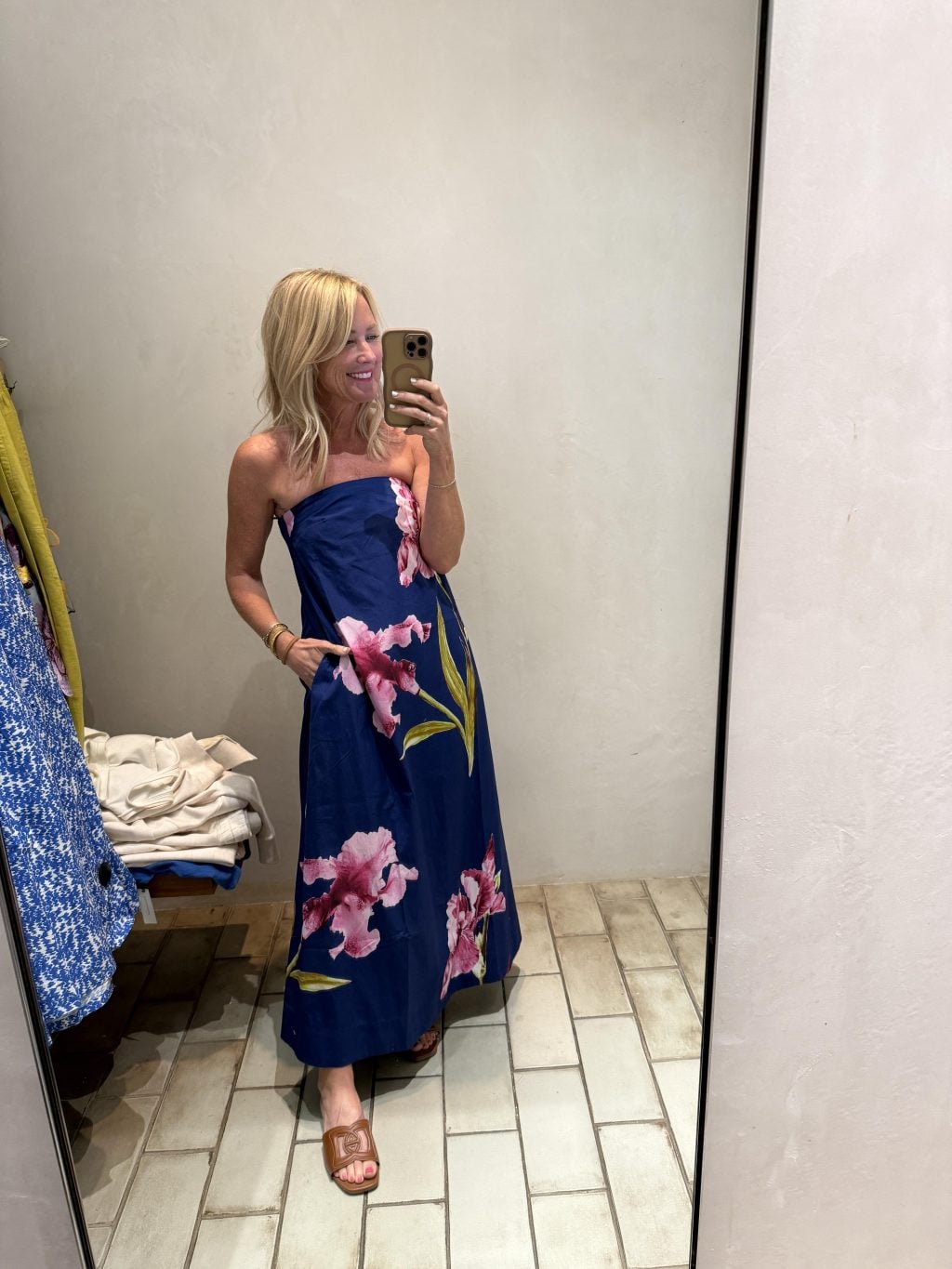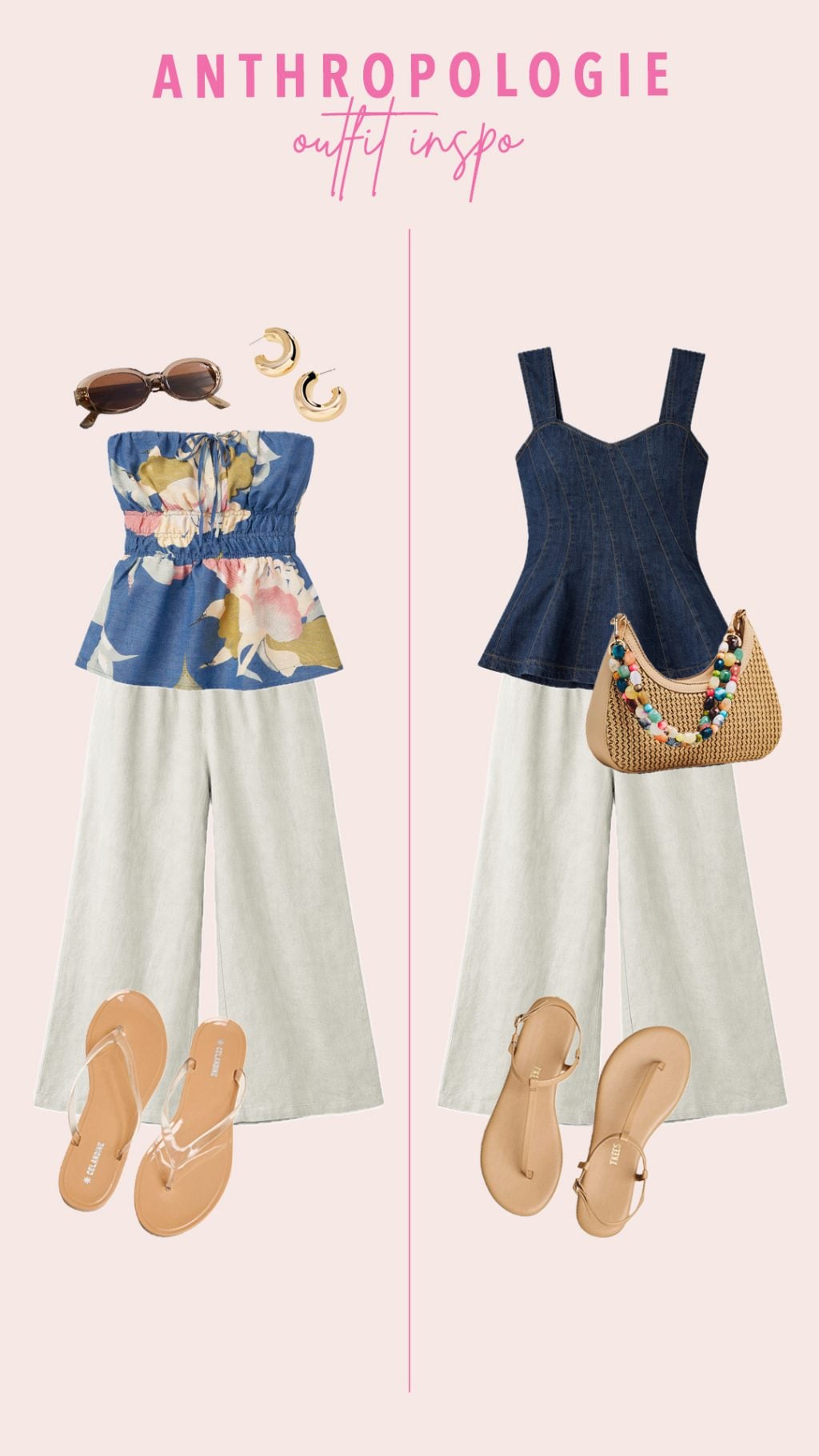 Floral Maxi Dress | Pink Floral Top | Denim Top | Blue Floral Strapless Top | Solid Blue Strapless Top Cream Linen Pants | Blue Linen Pants | Clear Flip Flops | Beige Sandals