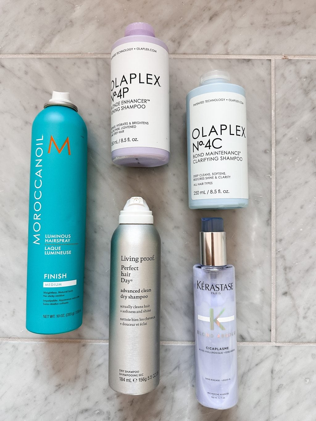 MoroccanOil Hair Spray | Olaplex No. 4P Purple Shampoo | Olaplex No. 4C Clarifying Shampoo | Living Proof Advanced Clean Dry Shampoo | Kรฉrastase Leave-In Treatment
