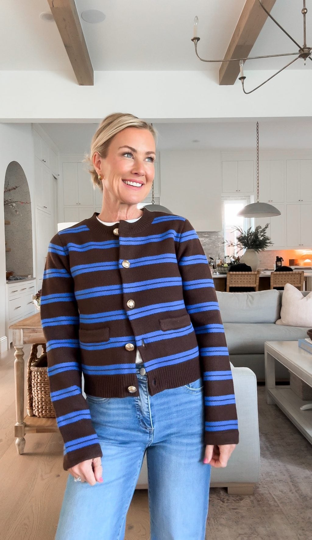 Striped Lady Cardigan (code CASSIE15) | White Crewneck Tee (Small) | Wide Leg Crop Jeans (size 26) | Love Bracelet | DY Heart Bracelet | Chain Link Bangle | Tennis Bracelet | Small Hoop Earrings