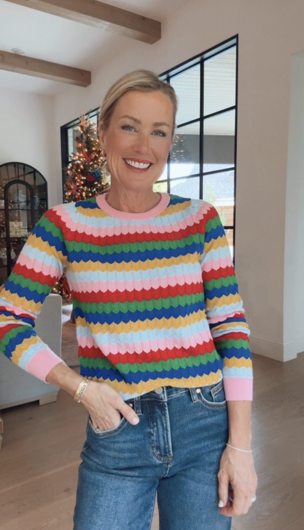 Rainbow Stripe Sweater (XS) (code CASSIE15) | Dark Wash Jeans (code CASSIE15) | Love Bracelet | DY Heart Bracelet | Chain Link Bangle | Tennis Bracelet | Shop All HERE