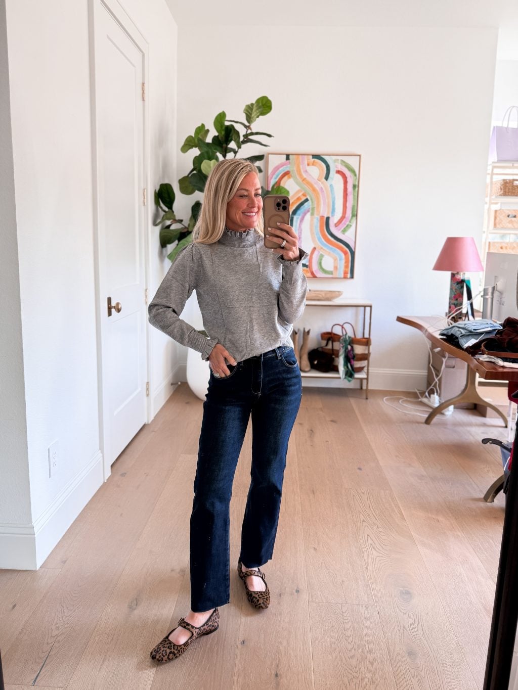 Ruffle Neck Sweater (Grey, Small) | Dark Wash Slim Jeans (size 26) (code CASSIE15) | Mary Jane Ballet Flats (Also HERE & HERE) | Love Bracelet | DY Heart Bracelet | Chain Link Bangle | Tennis Bracelet | Chunky Band Ring | Huggie Earrings | Shop All HERE