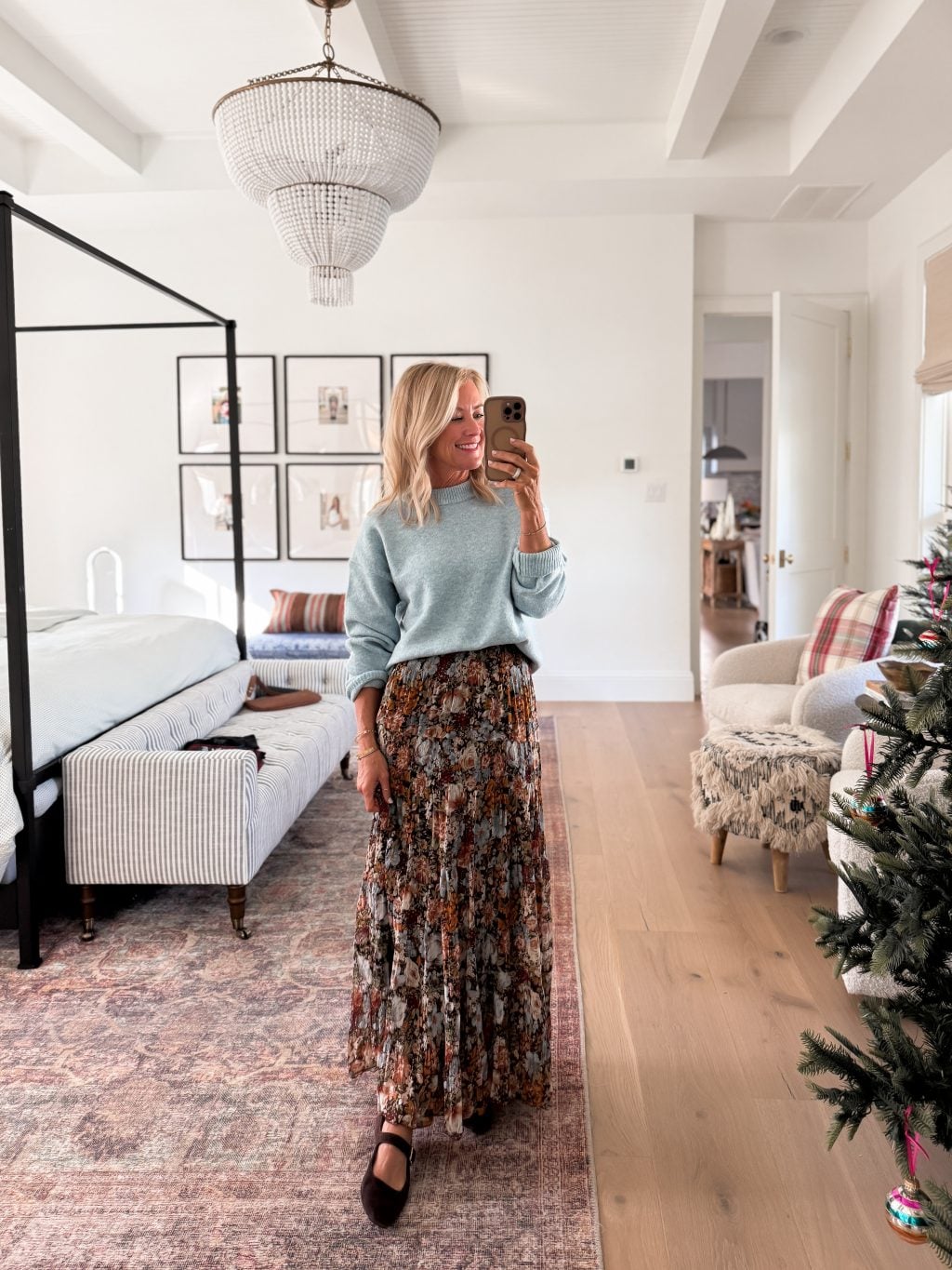 Mock Neck Sweater | Floral Maxi Dress (Coffee Floral, Small Long) | Mary Jane Ballet Flats (Also HERE & HERE) | Love Bracelet | DY Heart Bracelet | Chain Link Bangle | Tennis Bracelet | Shop All HERE